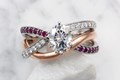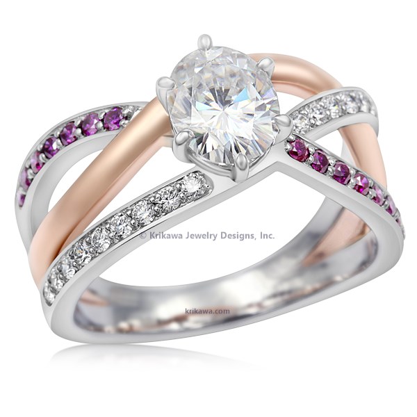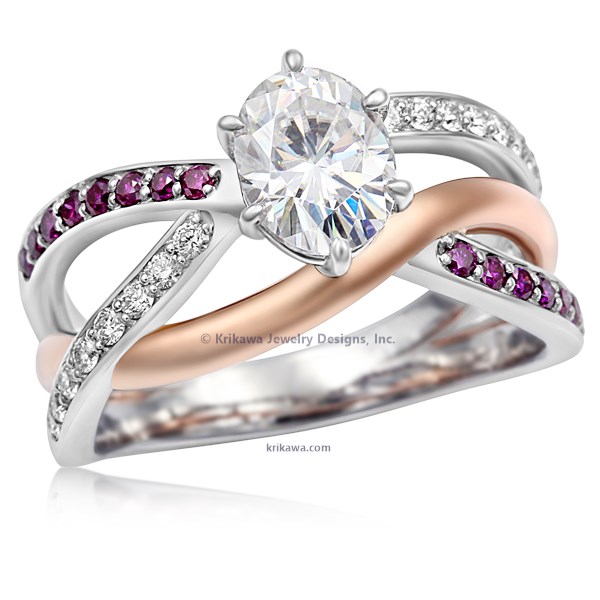 Woven with love, this unique ring features a trinity of polished and diamond or gemstone accented bands. This contemporary engagement ring features two metals entwined beneath a prong-set center stone. Each band is customized in the metal and or stones you want. A truly unique design that will be a one-of-a-kind work of art, handcrafted just for you.