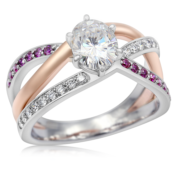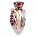 Woven with love, this unique ring features a collection of polished gems and metals. Two-toned bands intertwine beneath a prong-set center stone. A trinity of hand-picked stones makes this ring a one-of-a-kind piece of art.Customized here in 14k white and rose gold with a round lab-made ruby center stone.
