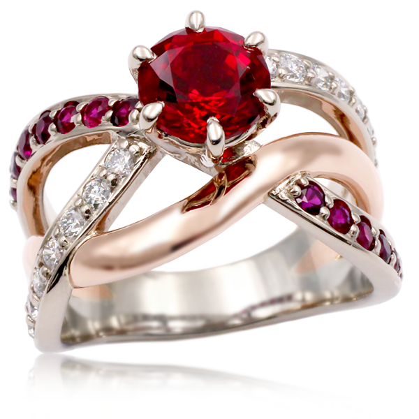 Woven with love, this unique ring features a trinity of polished and diamond or gemstone accented bands. This contemporary engagement ring features two metals entwined beneath a prong-set center stone. Each band is customized in the metal and or stones you want. A truly unique design that will be a one-of-a-kind work of art, handcrafted just for you.