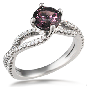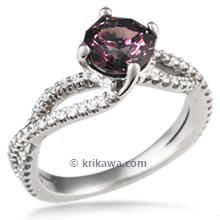 This paved ring is set with a raspberry-colored Celestial Compass cut sapphire from Larry Woods. It is matched with a slightly contoured wedding band.