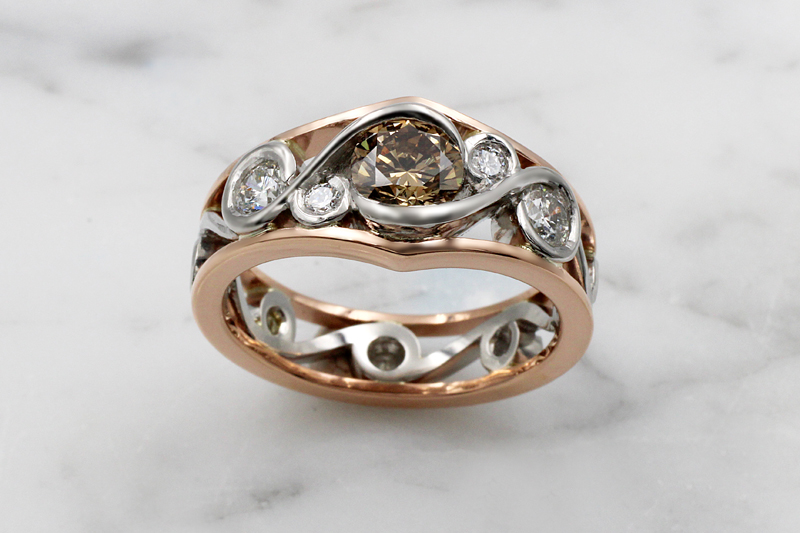 Shown in two-tone; 14k rose gold and platinum, with a 0.75ct diamond.