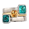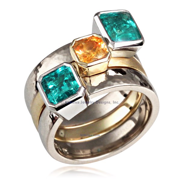 This three ring set, tri-stone hammered mother's ring offers modern sophistication with its unique trio of stone shapes and placement. Choose colored birthstones as seen here or keep it classic with traditional diamonds.Do you have your own special heirloom stones? We can create the settings for any stones, as these rings are made from scratch, every time. Want to check out our spectacular collection of colored gems?