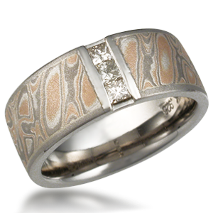 Suspended between two opposite channels are three small diamonds that appear to float within the negative space. The straight band is inlaid with your favorite mokume gane flavor.