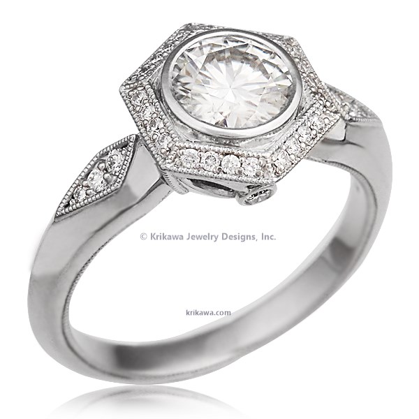 The Vintage Art Deco Engagement Ring is a study in contrast and harmony. Strong lines meet softened curves in a design that feels both architectural and romantic. A bezel-set center stone sits within a striking hexagonal halo, framed by diamond accents that flow down the band in elegant, arrow-like form. Every angle catches the light, every detail whispers of vintage elegance with a modern twist.