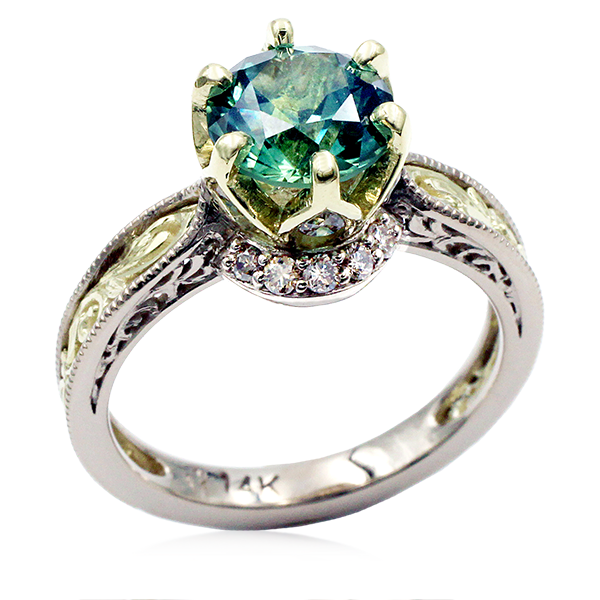 Shown in 14k green gold with a 1.22ct natural sapphire center stone and natural diamond accent stones.