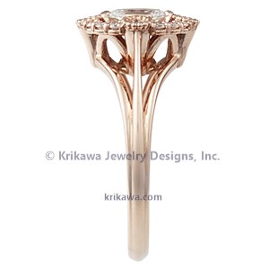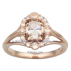This variation of this romantic engagement ring design was done in 14k yellow gold. The center stone is a 7mm oval cut diamond with white diamond accents.