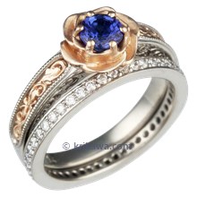 Shown in palladium and rose gold with a 5mm round blue sapphire center.