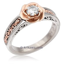The Vintage Scrollwork Rose Engagement Ring is an ode to old-world artistry and romantic symbolism. Flowing scrolls curl gently along the shoulders, guiding the eye toward a bezel-set center stone framed by a carved rose. The combination of floral and filigree-inspired detail creates an elegant silhouette that feels both historical and personal.