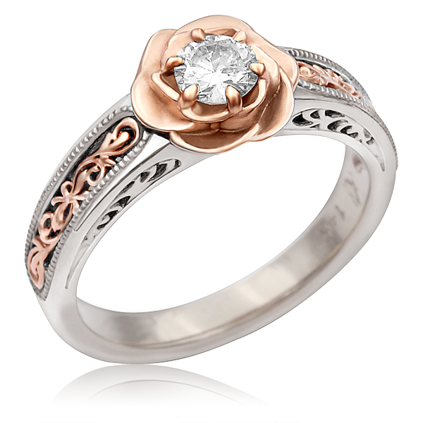 Vintage Scrollwork Rose Engagement Ring and Diamond Channel Wedding Band