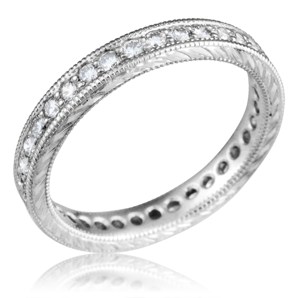 Indulge in the timeless allure of this bold band adorned with intricate leaf and vine carvings. Accented by delicate millgraining and fine detailing along the edges.