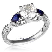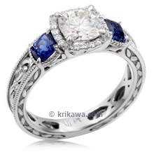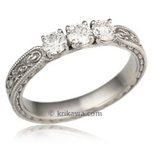 The Vintage Three Stone Engagement Ring With Curls is a romantic reverie carved in precious metal. Three stones speak of past, present, and future, a trio that shines with the weight of memory and the promise of what’s to come. Beneath the luminous center, elegant curls wrap around a hidden gem like a secret held close. This design evokes old-world charm with an air of enchantment, perfect for those who find meaning in every detail.