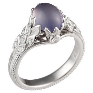 Play with color in this natural and vintage-inspired engagement ring. A wreath of diamond-studded leaves surrounds the center stone of your choice. The leaves reach up to a cathedral setting, housing a peek-a-boo stone. A perfect vintage touch of millegrain traces the ring’s profile. Imagine the possibilities with stone choices and metal tones! The band is 2.5mm wide at the palm.Shown in 14k rose gold and 18k white gold with Alexandrite and white diamond accents.