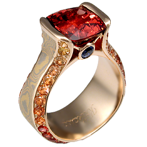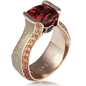 White mokume Juicy with 8mm moissanite cushion.*To maintain the signature juicy look, the suggested center stone shapes are square cushion and round gems. Stones have a required size to keep the juicy profile. Round stones need to be at least 8mm (2-carat) and Square Cushion needs to be at least 7mm wide. With smaller center stone sizes, we recommend adding a diamond halo to achieve the signature flair. Please inquire about other stone shapes.