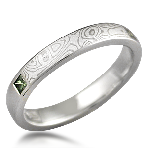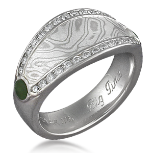 This custom mokume wedding ring is inlaid with White mokume. An inscription personalizes the inside of the band.