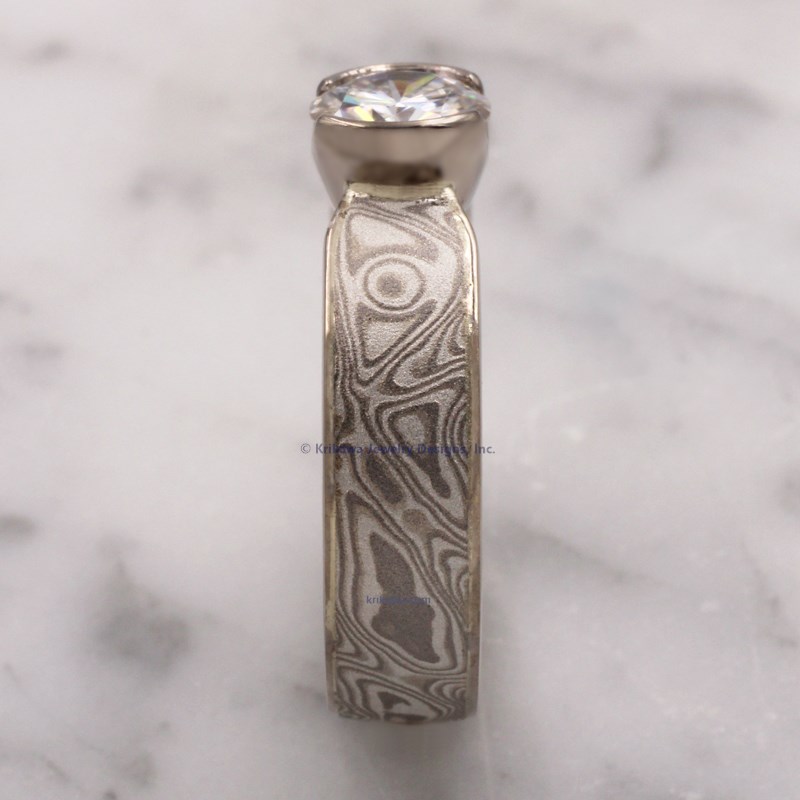This simple yet enchanting ring has a classic design with a contemporary twist. The band has a uniform width until it intersects the head with an elegant taper. Handcrafted in 14k white gold and White Mokume Gane with a 6MM round moissanite solitaire. The band measured 5mm in width.Size 6