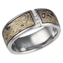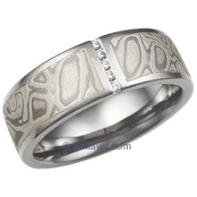 This wedding ring is inlaid with White mokume gane, is 8mm wide and has darkened lines around the mokume.