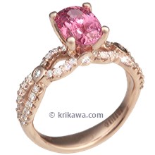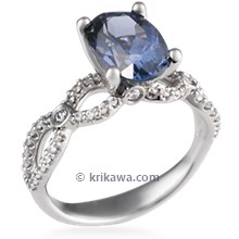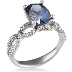 This elegant pave engagement ring is paired with a matching band, and is set with an oval blue spinel.