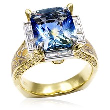 A Juicy Mokume Engagement Ring is a vibrant fusion of sculptural design and the ancient art of Mokume Gane. Sensual, diamond-paved curves rise upward to cradle a brilliant sapphire or diamond, creating a bold and luxurious centerpiece. Each Juicy ring showcases rich colors and textures, often accented with fancy color diamonds. With Mokume Gane’s organic wood-grain patterns, the Juicy style becomes a celebration of movement, artistry, and passion.
